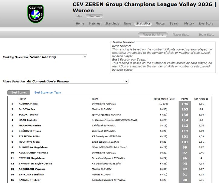 Диагоналът на Марица (Пловдив) Ива Дудова завърши като втората най-добра реализаторка в груповата фаза на Шампионската лига по волейбол за жени.